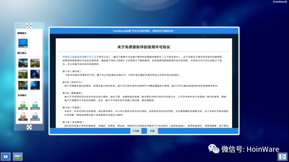 為了讓用戶更加便捷、直觀地體驗(yàn)HoinWare®品牌的多媒體互動(dòng)軟件產(chǎn)品,互云信息推出了一款可應(yīng)用于多點(diǎn)觸摸屏的免費(fèi)版互動(dòng)軟件(完全兼容紅外、電容、雷達(dá)、激光等多點(diǎn)觸摸屏),該軟件可廣泛應(yīng)用于多媒體展廳、培訓(xùn)、教學(xué)等場(chǎng)景的多媒體互動(dòng)和展示。