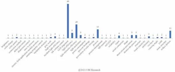該研究公司表示,QNED 的組成結(jié)構(gòu)已經(jīng)完成。UBI Research 表示,三星顯示器的剩余任務是找到一種方法來保持每個像素內(nèi)對齊的QNED 的數(shù)量。在 160 項專利中,49 項與 LED器件對齊(LED 對齊)相關,還有20項與發(fā)光效率相關的專利。