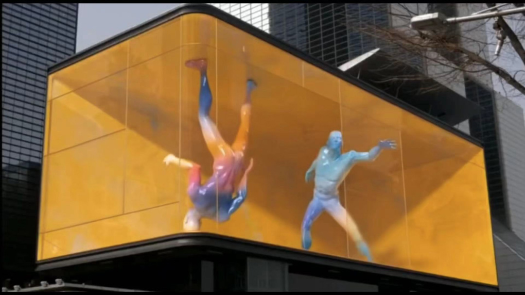 而從大屏的形狀上來看,目前的網(wǎng)紅裸眼3D屏絕大多數(shù)都是轉(zhuǎn)角屏。利用兩塊相鄰直角二維平面大屏中呈現(xiàn)三維物體的不同面,利用空間透視和折角屏的相鄰兩面成像性對人眼造成光影、明暗、虛實的視錯覺,使畫面內(nèi)容呈現(xiàn)體積感,也因此都有最佳觀看視角。