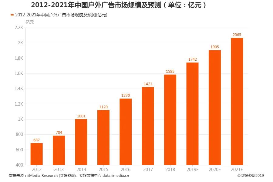 中外戶外廣告發(fā)展的規(guī)律表明,戶外廣告與經(jīng)濟(jì)發(fā)展呈正相關(guān)關(guān)系。戶外廣告因應(yīng)經(jīng)濟(jì)繁榮而不斷發(fā)展,同時(shí)也以自身的方式促進(jìn)經(jīng)濟(jì)發(fā)展。數(shù)據(jù)顯示,2012年以來,中國戶外廣告市場一直保持著非常穩(wěn)定的增長態(tài)勢,其中2018年為1585億元,2019年為1742億元,2021年預(yù)計(jì)將超過2065億元,與中國經(jīng)濟(jì)發(fā)展保持著高度的一致性。
