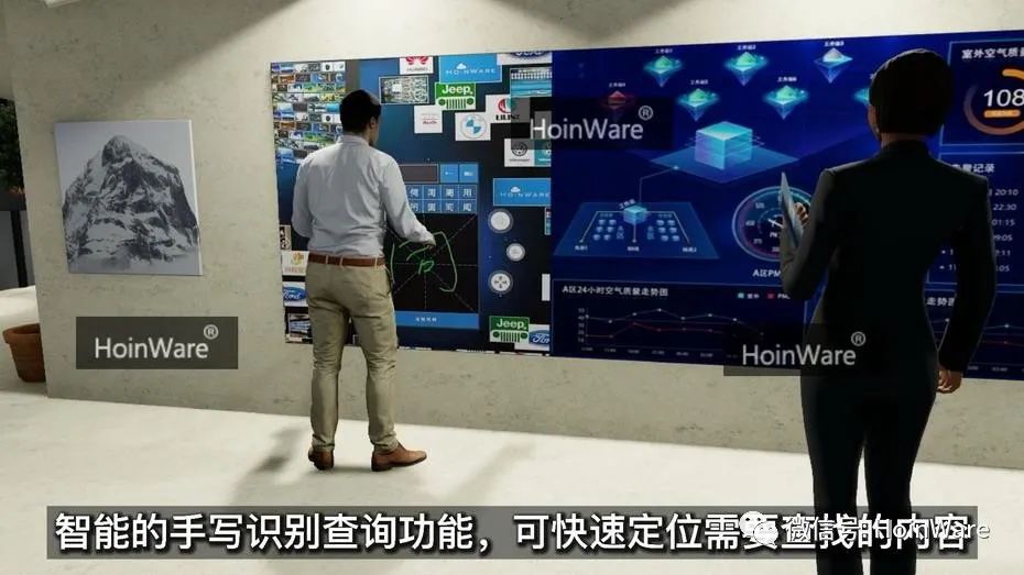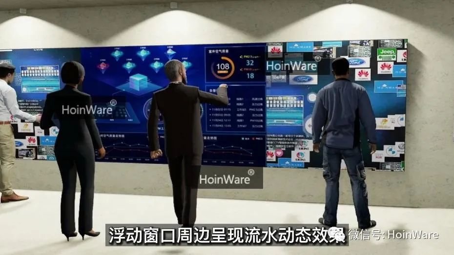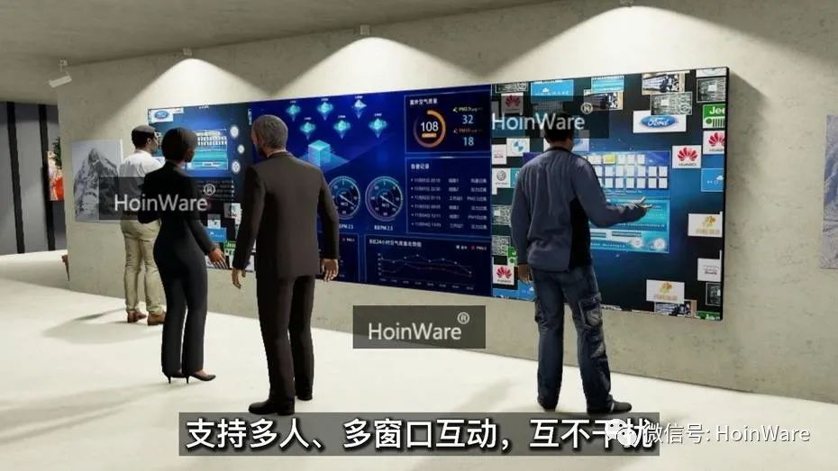 HoinWare互動(dòng)圖片墻軟件與大數(shù)據(jù)展示平臺(tái)結(jié)合的展廳互動(dòng)方案,實(shí)現(xiàn)在超寬觸控拼接屏上進(jìn)行多種信息的互動(dòng)和展示。HoinWare互動(dòng)圖片墻軟件顯示在左右兩側(cè),中間展示大數(shù)據(jù)平臺(tái)動(dòng)態(tài)數(shù)據(jù)(或其他第三方應(yīng)用界面),實(shí)現(xiàn)內(nèi)容互動(dòng)和信息展示的無(wú)縫融合。
