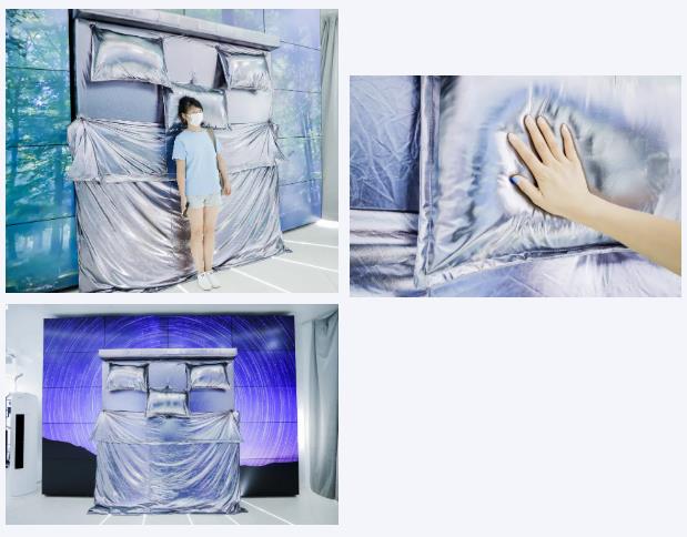 來到智能家居體驗區(qū),參觀者只需“躺”在床上,觸發(fā)枕頭上的壓力感應裝置,便可通過49英寸ADS無界拼接大屏,讓你的臥室幻化出星空云海、宇宙銀河、熱帶雨林等場景,讓參觀者仿若置身于夢境之中。