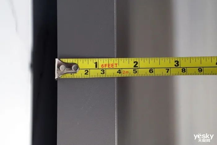 雷曼巨幕LEDPLAY采用三邊無邊框全面屏設(shè)計,屏占比達99%。其邊框厚度我們測量出來是6mm。值得點贊的是,Micro LED顯示面板四周沒有液晶電視會有的黑邊,實際顯示面積、視野效果要好很多。