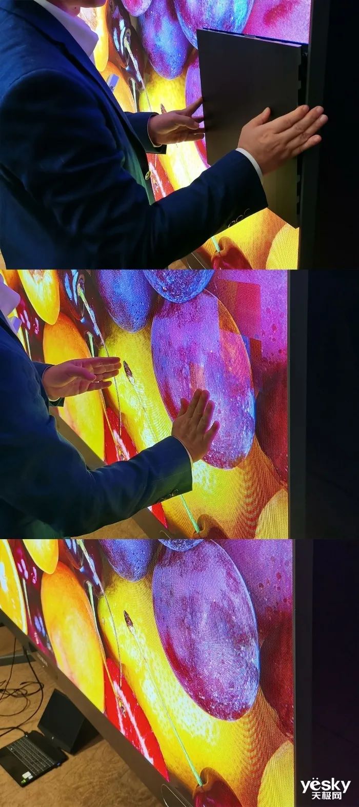 通過這一噴水測試,可以看到,雖然雷曼巨幕LEDPLAY是模塊化可拼接的,但表面防護非常到位,其拼接是“無縫拼接”。據(jù)工程師介紹,這是COB技術(shù)的優(yōu)勢,采用其它封裝方式的Micro LED是達不到如此水準的。