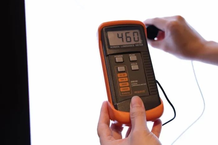 除了主觀體驗外,我們也使用儀器進行客觀測試,這部分我們使用亮度測試儀、專業(yè)色彩儀器紅蜘蛛5進行了測試。