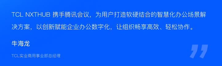 TCL NXTHUB V61系列已通過(guò)騰訊會(huì)議認(rèn)證,在豐富了與騰訊會(huì)議Rooms聯(lián)合的全場(chǎng)景會(huì)議室解決方案后,TCL宣布正式加盟騰訊會(huì)議“萬(wàn)室如意”計(jì)劃,免費(fèi)為企業(yè)改造100間有典型痛點(diǎn)和行業(yè)特色的會(huì)議室,并計(jì)劃3年時(shí)間與各行業(yè)客戶一起共同打造10萬(wàn)間如意會(huì)議室。