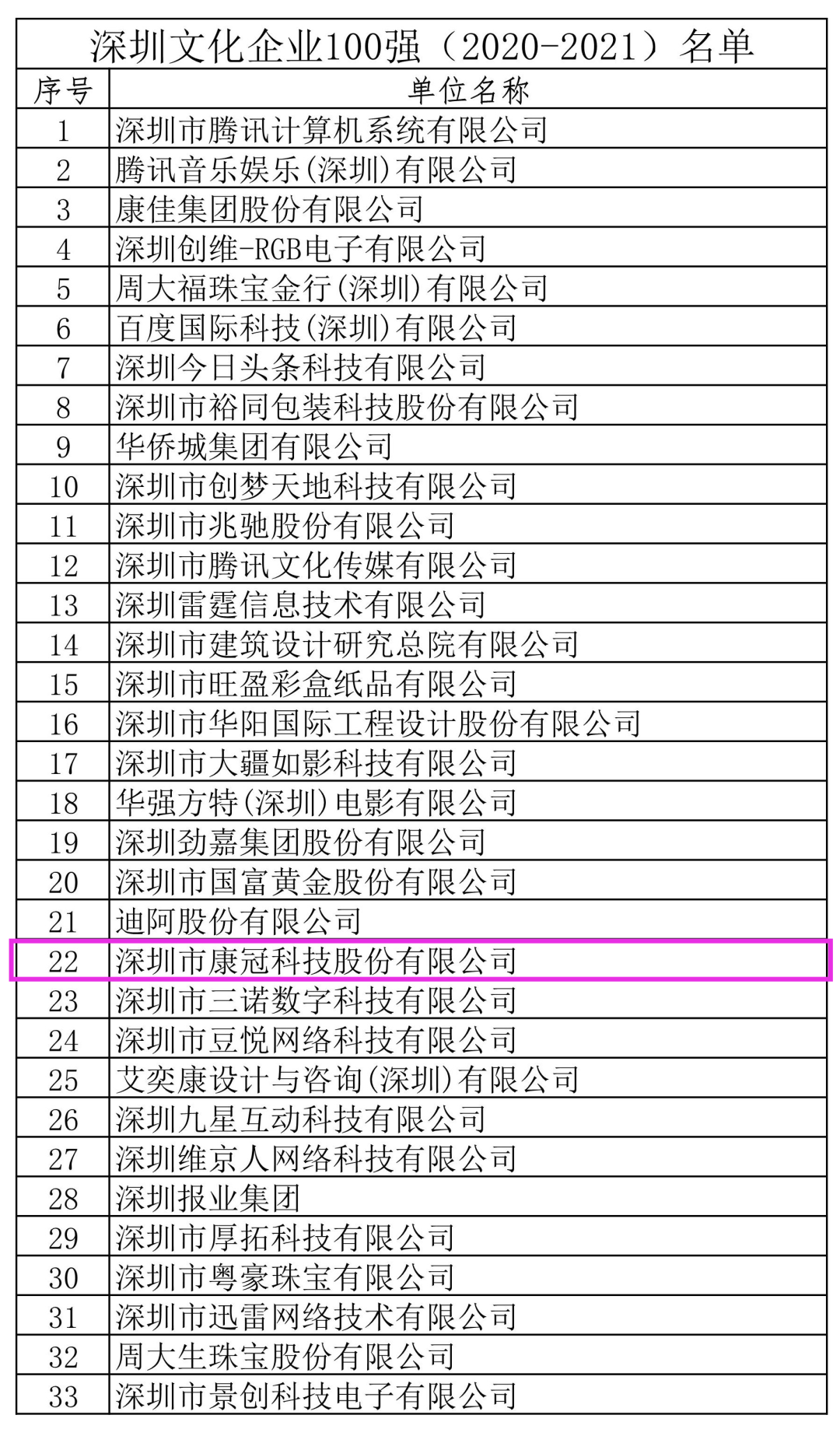 2021年9月,深圳市文化廣電旅游體育局發(fā)布了“ 深圳文化企業(yè)100強(qiáng) ”企業(yè)名單?倒诠境晒θ雵敬巍吧钲谖幕髽I(yè)100強(qiáng)”,位列榜單第22位。近期,公司收到了“深圳文化企業(yè)100強(qiáng)”牌匾。
