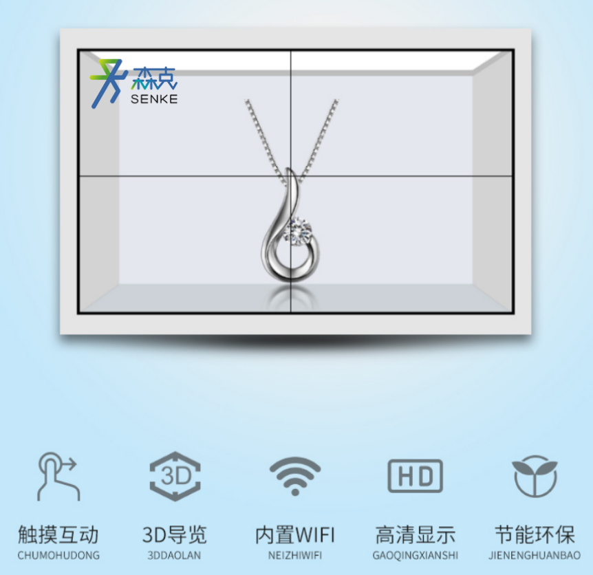 森克智能透明屏在不影響原有外觀的前提下就能穿透屏幕看到所展示的產(chǎn)品,提高畫面層次感;前虛后實(shí)細(xì)節(jié)展示,不用帶3D眼鏡,就可以產(chǎn)生各種特效影像,讓觀眾進(jìn)入一種虛實(shí)融合、亦真亦幻的奇妙世界;還能同時(shí)播放為珍貴展品精心定制的創(chuàng)意廣告內(nèi)容,是一款全新的打破常規(guī)的創(chuàng)意展示手段;讓信息傳播以一個(gè)更加明朗、更加直觀的方式呈現(xiàn)出來(lái),提升了品牌傳播效率,拉升了展品檔次,成為線下的吸睛神器。