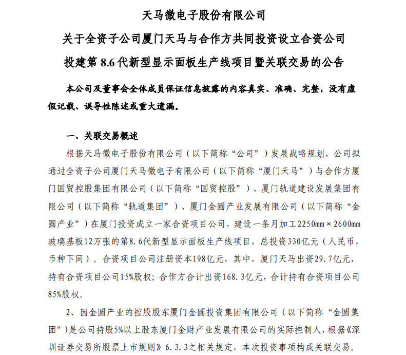 4月12日,深天馬A公告,將投資330億元建設(shè)一條8.6代a-Si和IGZO液晶面板線,以車載、IT顯示屏(包括平板、筆電、顯示器等)、工業(yè)品等顯示應(yīng)用為目標(biāo)產(chǎn)品市場(chǎng)。