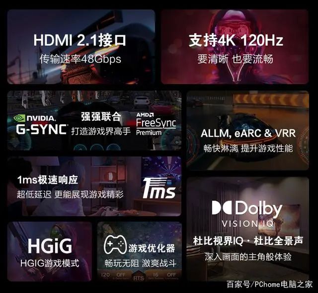 LG C2搭載新一代OLED Evo面板,擁有4K分辨率的120Hz高刷新率面板。同時支持完整的HDMI 2.1接口,可以實現(xiàn)48Gbps的傳輸效率以及對NVDIA G-Sync、AMD FreeSync Premium的良好兼容性,使得高速運動的游戲畫面也能擁有清晰流暢的效果,避免快速移動造成的畫面撕裂。同時HDMI 2.1的ALLM eARC和VRR技術則可以提升游戲性能,享受酣暢淋漓的游戲體驗。同時內(nèi)置的游戲優(yōu)化器可以整合模式優(yōu)化設置,根據(jù)不同的游戲設定不同的參數(shù)。LG與游戲品牌合作打造的HGiG技術則可以提供出色的HDR畫質(zhì)。