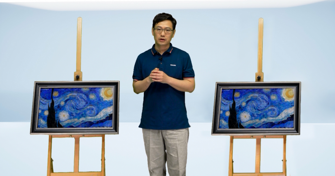 實際上,其中一幅油畫正是飛利浦的OLED顯示器的顯示畫面。在屏幕最真實的色彩還原下,畫面與實物幾乎可以達(dá)到100%復(fù)刻的效果呈現(xiàn),讓人幾乎難辨真?zhèn)巍?/P>