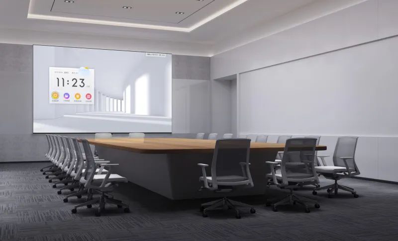 超薄機身,整體屏占比高達97%,可選擇壁掛、支架安裝,完美融入會議空間,為45㎡以上超大會議空間與展廳使用。