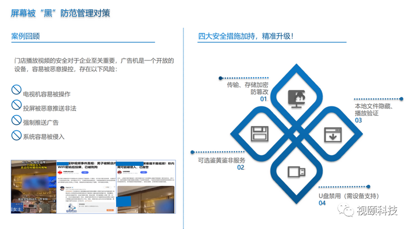 此前就曾發(fā)生過(guò)知名連鎖餐飲不雅視頻事件,就是客戶使用了手機(jī)WIFI投屏功能,向電視上面投放不雅視頻,這是電視機(jī)最大的弊端。而專業(yè)的信發(fā)系統(tǒng),可以通過(guò)多重加密和設(shè)置權(quán)限管理來(lái)避免這個(gè)問(wèn)題。