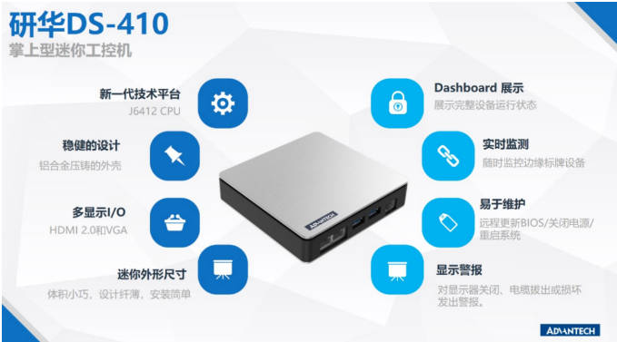 研華推出DS-410嵌入式數(shù)字標(biāo)牌系統(tǒng)。作為一款Mini PC,DS-410以小巧的外觀和強(qiáng)大的計(jì)算性能超越了傳統(tǒng)的數(shù)字標(biāo)牌產(chǎn)品。該款產(chǎn)品采用第八代賽揚(yáng)平臺(tái)J6412處理器,支持4K顯示,編解碼較上一代相比性能有很大提升,同時(shí)具備工業(yè)認(rèn)證。