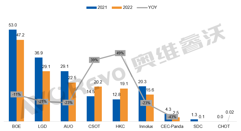 HKC(惠科)2022年出貨19.1M,全年出貨表現(xiàn)亮眼,同比增長了49%。在面板供應(yīng)緊張時期迅速擴大產(chǎn)能,借此豐富客戶結(jié)構(gòu)。面臨下半年的需求衰退,其客戶結(jié)構(gòu)進一步調(diào)整,抓住對潛力品牌供應(yīng)的機會,使其出貨呈現(xiàn)了逆勢增長。2023年在產(chǎn)品升級的基礎(chǔ)上,在當前供應(yīng)匱乏的商用市場也將艱難前行。