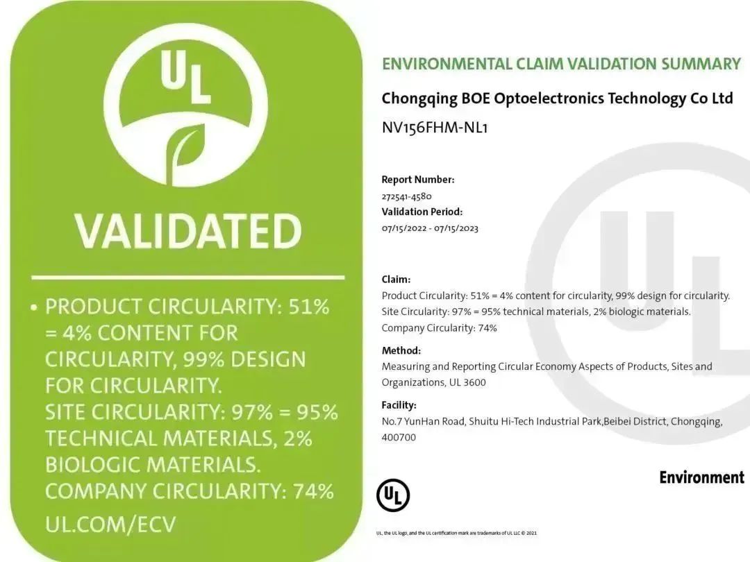 針對“雙碳”及環(huán)境管理方面,京東方逐步推行能源管理體系、產(chǎn)品碳足跡、廢棄物零填埋、循環(huán)經(jīng)濟(jì)系數(shù)等一系列國際標(biāo)準(zhǔn)認(rèn)證,2022年,重慶京東方獲得 UL 3600 循環(huán)經(jīng)濟(jì)系數(shù)驗(yàn)證證書及 UL 2799 廢棄物零填埋金級驗(yàn)證證書,是中國大陸首家通過 UL 3600 循環(huán)經(jīng)濟(jì)系數(shù)認(rèn)證并取得認(rèn)證證書的企業(yè)。