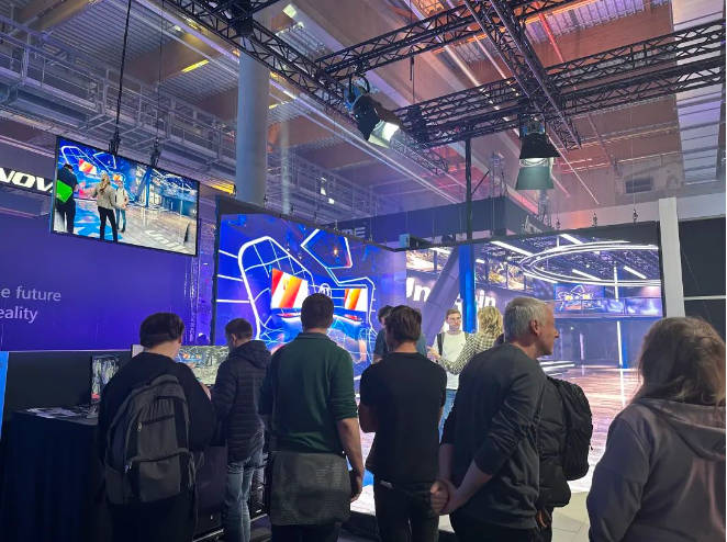 本次展位上,洲明攜手行業(yè)生態(tài)伙伴Pixotope,以“三面LED屏方案”現(xiàn)場(chǎng)還原XR虛擬拍攝場(chǎng)景,該場(chǎng)景主要可應(yīng)用于廣告拍攝、帶貨直播等方面。其中,立屏使用洲明UpadIV Pro2.6,地磚屏使用2022北京冰雪盛會(huì)同款UDF3.9系列。