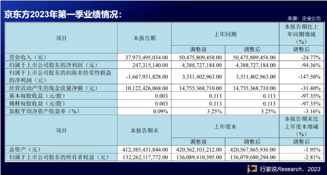 今年第一季度,京東方實現(xiàn)營收379.73億元,同比下降24.77%;實現(xiàn)歸母凈利潤2.47億元,同比增長94.36%。