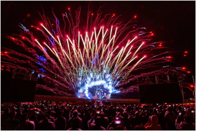 作為點(diǎn)亮儀式的主點(diǎn)位,由利亞德集團(tuán)勵(lì)豐文化打造的“和美橋夜間文旅休閑客廳”在3、2、1...倒計(jì)時(shí)結(jié)束之后,流光從中華文化公園同心廣場(chǎng)向和美橋匝道橋、引橋,不斷匯聚到主橋、橋塔上,《和美雪原●數(shù)譜華章》和美橋燈光秀正式上演。燈光秀以樂(lè)為章,以景為卷,以光作畫,以“民族團(tuán)結(jié)和美共進(jìn),推動(dòng)雪域高原高速發(fā)展”為創(chuàng)想原點(diǎn),運(yùn)用先進(jìn)的數(shù)字光影技術(shù)點(diǎn)亮演出現(xiàn)場(chǎng),絢麗璀璨的煙花陣列,高揚(yáng)大氣的背景音樂(lè),共形屏為載體的“和美之眼”大放異彩,打造了一場(chǎng)別具聲色的雪域光影盛宴。
