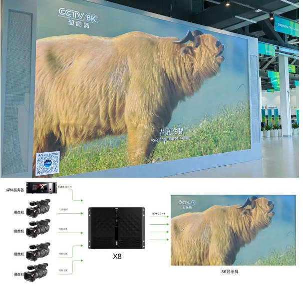 4路HDMI2.0、4路12G SDI信號(hào)源,點(diǎn)對(duì)點(diǎn)輸入,輸出到8K屏幕上