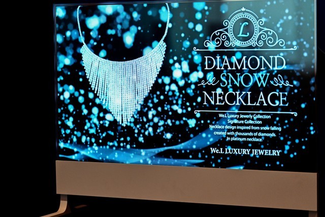 透明OLED show case擁有兩塊屏幕,前方透明,中間放置展示商品;后方OLED可以隨變換襯托背景,能讓展品更加立體、生動。