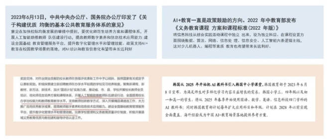 2023年6月13日,中共中央辦公廳、國(guó)務(wù)院辦公廳印發(fā)了《關(guān)于構(gòu)建優(yōu)質(zhì)均衡的基本公共教育服務(wù)體系的意見》,著重強(qiáng)調(diào)AI+教育在校園教學(xué)場(chǎng)景中的落地。據(jù)IDC最新數(shù)據(jù)顯示并預(yù)測(cè),到2027年,教育市場(chǎng)規(guī)模將超過1500億美元,屆時(shí)超過90%的教育學(xué)習(xí)終端將搭載AI相關(guān)功能!癆I+教育”的應(yīng)用場(chǎng)景方案將成為教育行業(yè)數(shù)字化轉(zhuǎn)型趨勢(shì)。