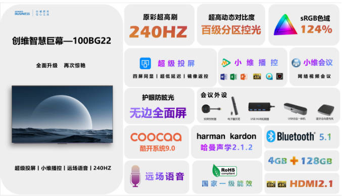 創(chuàng)維100BG22全面提升硬件配置,產(chǎn)品配置4K 120HZ霧面防眩光、大功率哈曼卡頓和DTS X認(rèn)證音效,四核處理器、4GB+128GB存儲(chǔ),HDMI2.1、藍(lán)牙5.1及各種輸入和輸出接口一應(yīng)俱全。加上創(chuàng)維獨(dú)有的酷開(kāi)系統(tǒng)9.0,全生態(tài)安卓軟件支持,支持第三方軟件和外設(shè)擴(kuò)展。給項(xiàng)目加分,給體驗(yàn)加分,讓客戶滿意。