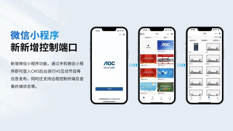 更新后的CMS系統(tǒng)版本新增眾多后臺(tái)管控端口,其通過手機(jī)微信小程序即可登入CMS后臺(tái)進(jìn)行H5互動(dòng)節(jié)目等信息發(fā)布,同時(shí)還支持遠(yuǎn)程控制終端及查看終端狀態(tài)等。