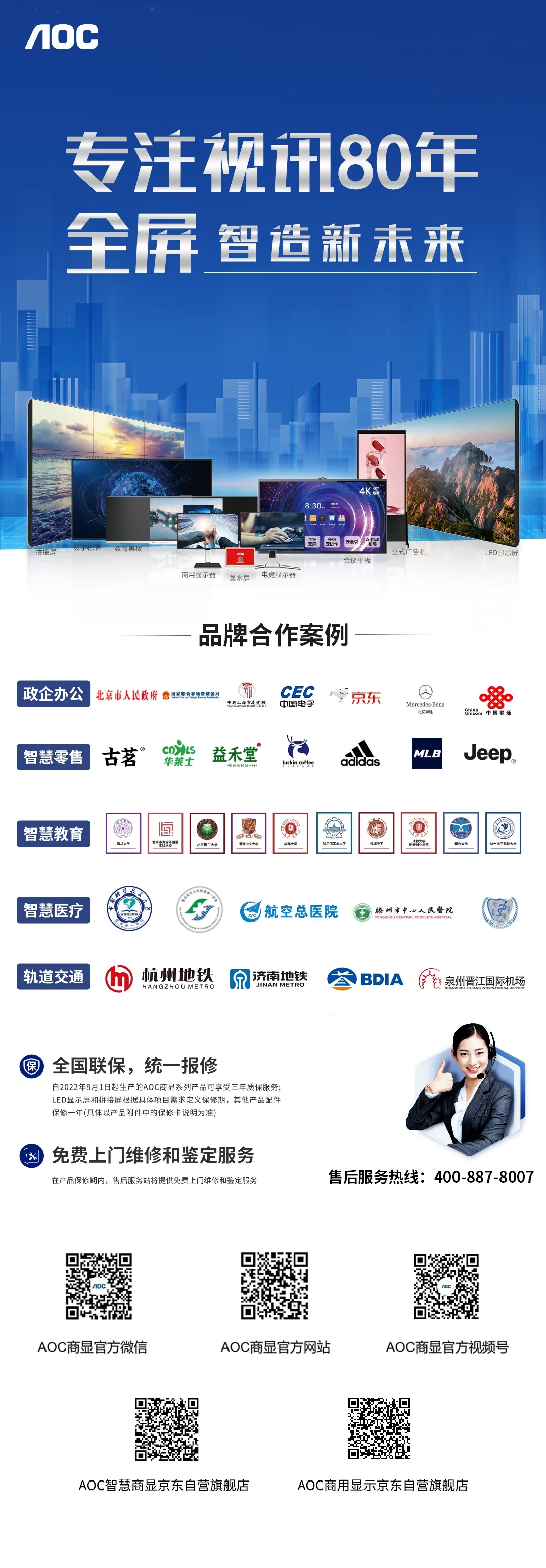 作為全球知名的專業(yè)顯示設(shè)備提供商和品牌商,AOC為全球消費(fèi)者提供液晶顯示器、液晶電視、拼接屏、數(shù)字標(biāo)牌、商用大屏、高端會(huì)議智能教學(xué)平板、小間距LED、云端一體機(jī)等視訊全生態(tài)產(chǎn)品線,并提供一站式商顯解決方案。其前身為1934年創(chuàng)立于美國(guó)芝加哥的全球第一批彩色電視機(jī)制造商Admiral,憑借八十余年來(lái)在視訊領(lǐng)域的專業(yè)、專注與專精,AOC已在全球設(shè)有5個(gè)創(chuàng)新研發(fā)基地和12座制造基地,足跡遍布全球100多個(gè)國(guó)家和地區(qū)。近年來(lái),AOC逐步拉大與競(jìng)品在銷(xiāo)量與市占率中的距離,2018年更是以近470萬(wàn)臺(tái)市場(chǎng)銷(xiāo)量及26%市場(chǎng)占有率,連續(xù)九年蟬聯(lián)中國(guó)顯示器市場(chǎng)銷(xiāo)量冠軍,成為享譽(yù)國(guó)際的視訊領(lǐng)導(dǎo)品牌。