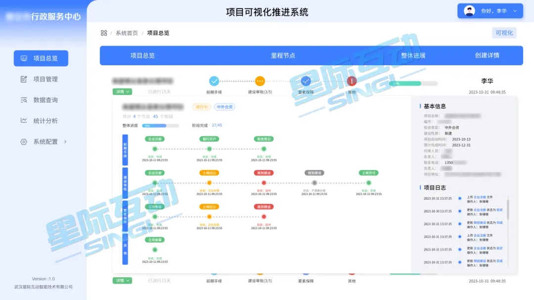 星際互動政務項目推進可視化管理平臺是一個集數據整合、實時監(jiān)控、決策支持等功能于一體的綜合性系統(tǒng),旨在通過可視化技術提高政府項目管理的效率和透明度。政務項目推進可視化管理平臺為大項目提供全程跟蹤、項目管理、資料上傳、全局共享、數據統(tǒng)計分析等功能,提高項目管理的效能與透明度,為決策者提供直觀的數據支持和合理的決策依據,促進大項目保障服務穩(wěn)定、高效推進,為大項目保駕護航提供更加科學化手段。